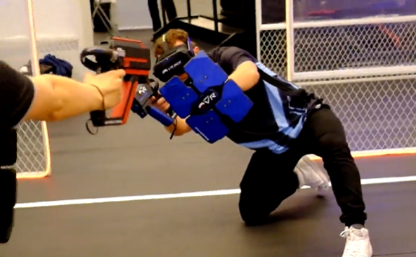 Usando uma pistola laser e escudo de proteção, o jogador deve atirar em pontos vitais do adversário,